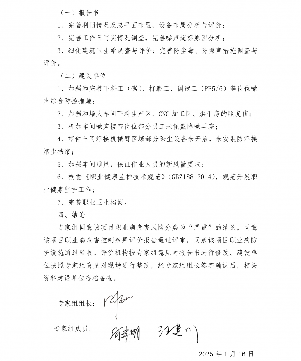 結(jié)論:項目控制效果評價判定為“職業(yè)病危害風險分類嚴重”的建設項目。 根據(jù)對本項目現(xiàn)場調(diào)查、職業(yè)病危害因素檢測結(jié)果和項目相關(guān)資料的綜合分析,本項目職業(yè)衛(wèi)生防治工作符合國家法律、法規(guī)的相關(guān)規(guī)定,采取的職業(yè)病防治措施基本可行,日常運行過程中在一定程度上能控制和降低職業(yè)病危害因素對作業(yè)人員健康的影響,項目在落實了本次評價報告提出的補充措施和建議后,能夠滿足職業(yè)病防治工作的需要。本項目已具備職業(yè)病防護設施竣工驗收的條件。 建議: (1)車間加強通風要求,保證作業(yè)人員的新風量要求。 (2)根據(jù)《職業(yè)健康監(jiān)護技術(shù)規(guī)范》(GBZ188-2014)結(jié)合項目實際情況,做好健康監(jiān)護工作,“兩檔”管理制度。“兩檔”內(nèi)容包括職業(yè)衛(wèi)生檔案和職業(yè)健康監(jiān)護檔案。 (3)按照《用人單位職業(yè)健康監(jiān)護監(jiān)督管理辦法》(國家安監(jiān)總局令〔2012〕第49號)、《職業(yè)健康監(jiān)護技術(shù)規(guī)范》(GBZ188-2014)相關(guān)規(guī)定對新進或調(diào)崗作業(yè)人員進行崗前體檢、并對離崗或調(diào)離作業(yè)人員進行離崗健康檢查。 (4)建設單位應按照《工作場所職業(yè)衛(wèi)生管理規(guī)定》(國家衛(wèi)生健康委員會令〔2020〕第5號)的規(guī)定:職業(yè)病危害嚴重的用人單位,應當委托具有相應資質(zhì)的職業(yè)衛(wèi)生技術(shù)服務機構(gòu),每年至少進行一次職業(yè)病危害因素檢測,每三年至少進行一次職業(yè)病危害現(xiàn)狀評價。檢測、評價結(jié)果應當存入本單位職業(yè)衛(wèi)生檔案,并向衛(wèi)生健康主管部門報告和勞動者公布。 (5)建設單位應根據(jù)《職業(yè)病危害項目申報辦法》(國家安全生產(chǎn)監(jiān)督管理總局令第48號)的規(guī)定,將此次控制效果評價報告與職業(yè)病危害因素現(xiàn)場檢測結(jié)果向當?shù)刂鞴懿块T進行申報。 (6)根據(jù)《國家衛(wèi)生健康委辦公廳關(guān)于進一步加強用人單位職業(yè)健康培訓工作的通知》國衛(wèi)辦職健函〔2022〕441號的要求進行職業(yè)衛(wèi)生培訓。 (7)定期對除塵、廢氣處理設施進行檢查、維護,發(fā)現(xiàn)有堵塞、損壞或其他原因?qū)е虏荒苷9ぷ鞯?,應及時進行清理、設備維修,并做好相關(guān)維護保養(yǎng)記錄。 (8)加強噪聲作業(yè)人員的個體防護和職業(yè)健康監(jiān)護。 (9)加強外委作業(yè)人員的職業(yè)衛(wèi)生管理,對焊工、打磨工加強個體防護和職業(yè)健康監(jiān)護。 (10)建設單位應加強女工的勞動保護,不得安排孕期、哺乳期的女職工從事對本人和胎兒、嬰兒有危害的作業(yè)。 (11)應急救援物資的使用人員,應接受相應的培訓,熟悉裝備的用途、技術(shù)性能及有關(guān)使用說明資料,并遵守操作規(guī)程;及時對車間內(nèi)配備的應急救援藥箱進行檢查,對應急救援藥品進行有效性查驗,及時補充更換。 (12)粉塵防爆措施嚴格以安全評價報告、安全設施設計專篇提出的措施為準。 (13)針對維修、清污存在的受限空間作業(yè)危害,應加強受限空間作業(yè)監(jiān)管,嚴格按照《缺氧危險作業(yè)安全規(guī)程》(GB8958-2006)、《密閉空間作業(yè)職業(yè)危害防護規(guī)范》(GBZ/T205-2007)進行作業(yè)。 (14)本次職業(yè)病危害控制效果評價只針對目前生產(chǎn)狀況,公司今后遇單位名稱、法定代表人或者負責人發(fā)生變更,須按時申報;或因技術(shù)、工藝或原輔材料發(fā)生改變而引起職業(yè)病危害因素發(fā)生變化時,應進一步進行職業(yè)病危害因素評價。 |