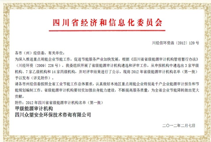 2012年,本公司由四川省經(jīng)濟(jì)和信息化委員會確定為甲級能源審計(jì)機(jī)構(gòu),在四川省內(nèi),各個行業(yè)的高能耗企業(yè)都屬于本公司的業(yè)務(wù)范圍?,F(xiàn)有注冊能源審計(jì)師10人,先后為100余家企業(yè)提供了專業(yè)的能源審計(jì)和節(jié)能規(guī)劃,為四川省節(jié)能降耗做出了相應(yīng)的貢獻(xiàn)。